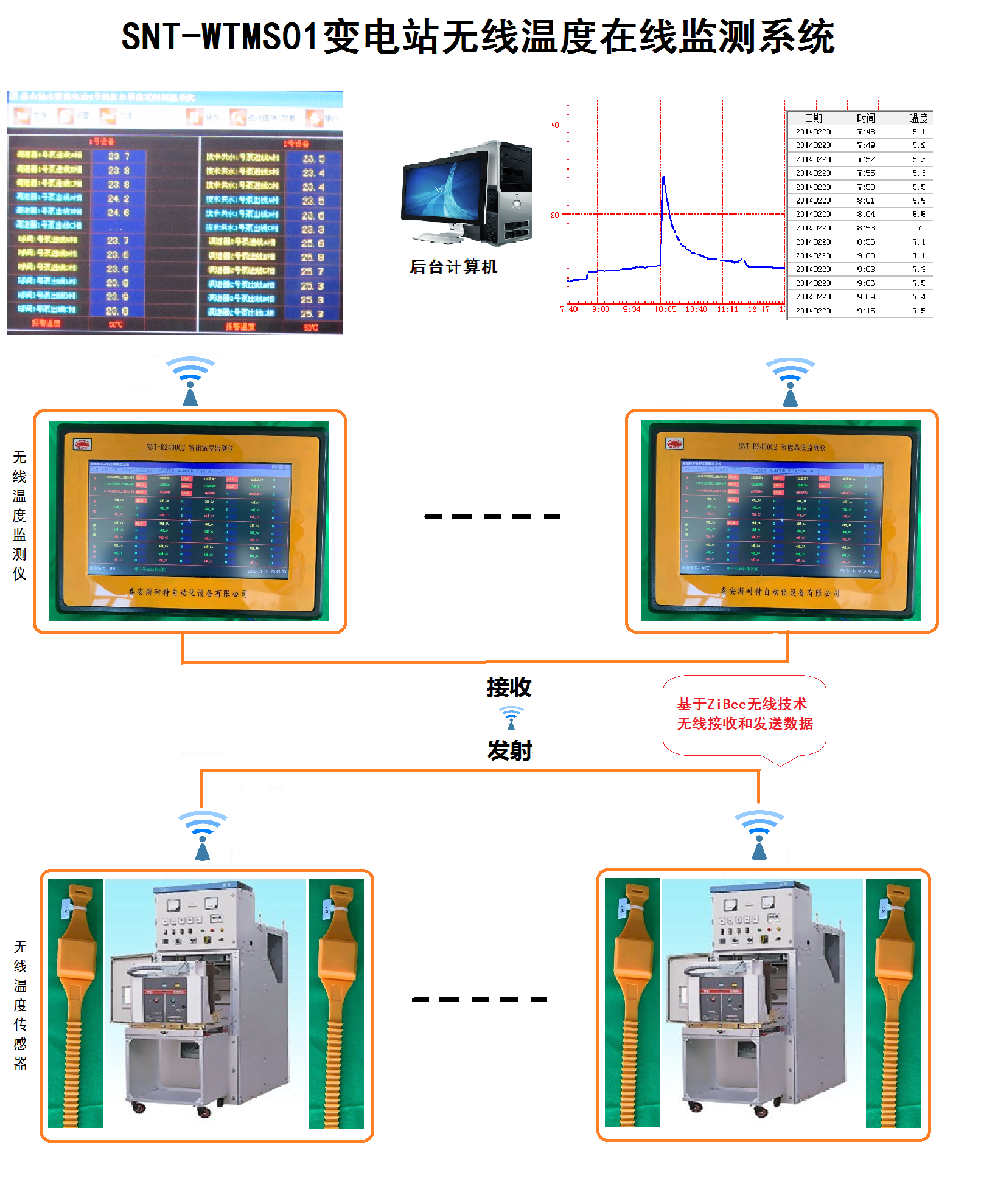 2. 智能無線溫度監(jiān)測儀:SNT-R2400JS/SNT-R433JS, SNT-R2400C2/SNT-R433C2, SNT-R2400C1/SNT-R433C1,SNT-R2400AY/SNT-R433AY,SNT-R2400BXS/SNT-R433BXS,SNT-R2400BX/SNT-R433BX, SNT-R2400J/SNT-R433J根據(jù)現(xiàn)場及用戶需求7種型號可選 ,采集溫度數(shù)據(jù)并無線傳輸至中控PC;