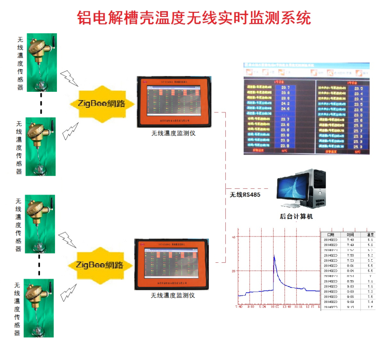 鋁電解槽殼無(wú)線溫度在線監(jiān)測(cè)系統(tǒng)有無(wú)線溫度傳感器、智能溫度監(jiān)測(cè)儀(接收/發(fā)射)、后臺(tái)監(jiān)控計(jì)算機(jī)、后臺(tái)監(jiān)測(cè)軟件組成。